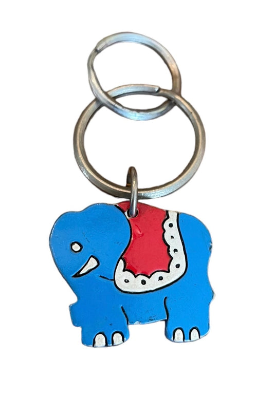 Vintage Blue Elephant Keychain Key Ring Wooden Painted 1.5"
