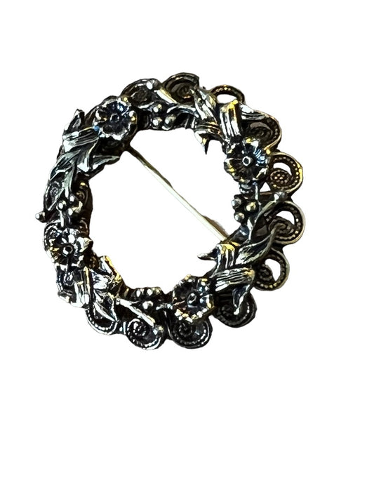 Vintage Floral Filagree Round Wreath Brooch 1.25" diameter