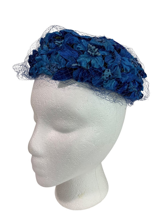 Blue Floral Veil Hat 1950s Net Fascinator Pillbox Style Miss Sally Box John Wanamaker