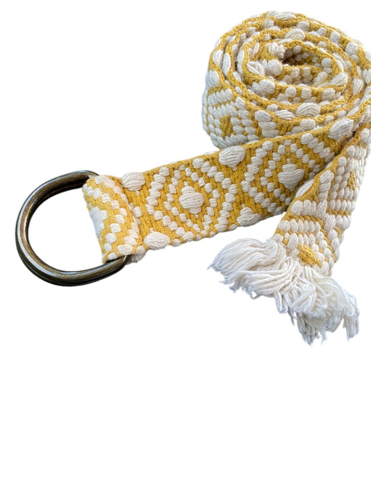 Womens Boho Woven Belt D-Ring Fringed 1.5 Inch Width Gold Off White