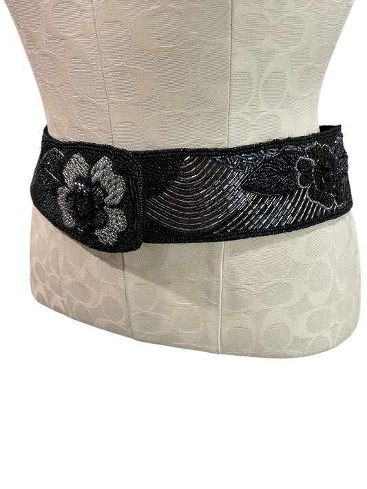 Vintage Beaded Black Silvertone Womens Belt Hook & Loop Closure 29 Inch Waist
