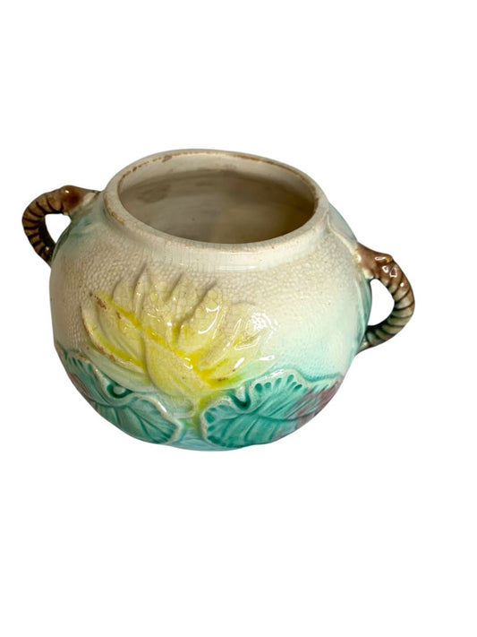 English Majolica Sugar Bowl Pond Lily and Rope Antique