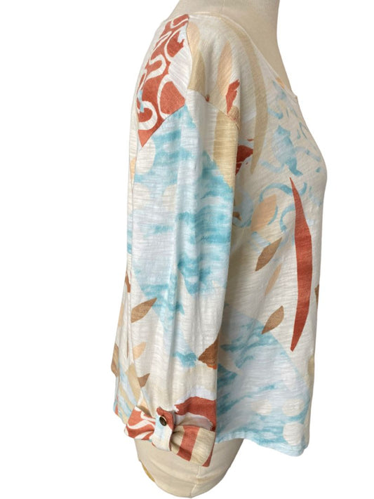 1 (Med) Chico's Earth Tone Leaf Pattern Shirt Blouse Roll-Tab Sleeves