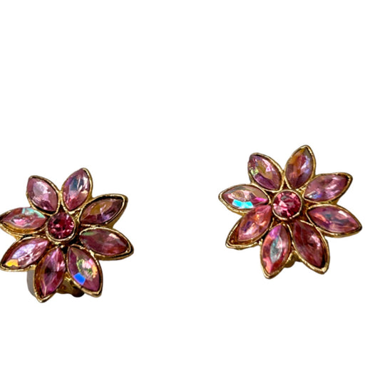 1990s Clip On Pink Crystal Flower Earrings 3/4" Diameter Non-Pierced Goldtone