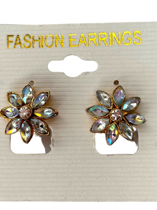 1990s Clip On Clear Crystal Flower Earrings 3/4" Diameter Non-Pierced Goldtone