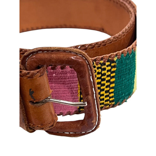Size 34 Handmade Woven Multi Colored Tapestry Brown Leather Belt Boho Western