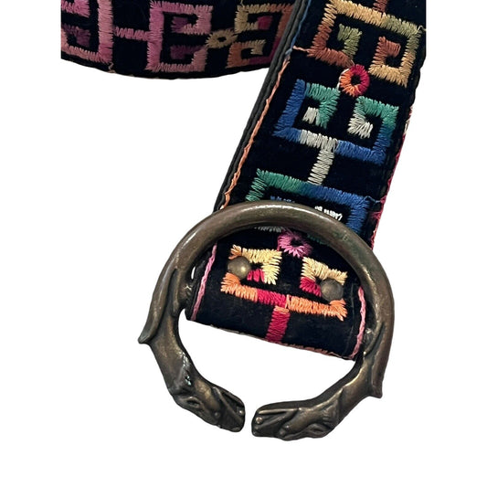 Size 33” Embroidered Multi Colored Tapestry Brown Leather Belt Boho Velvet