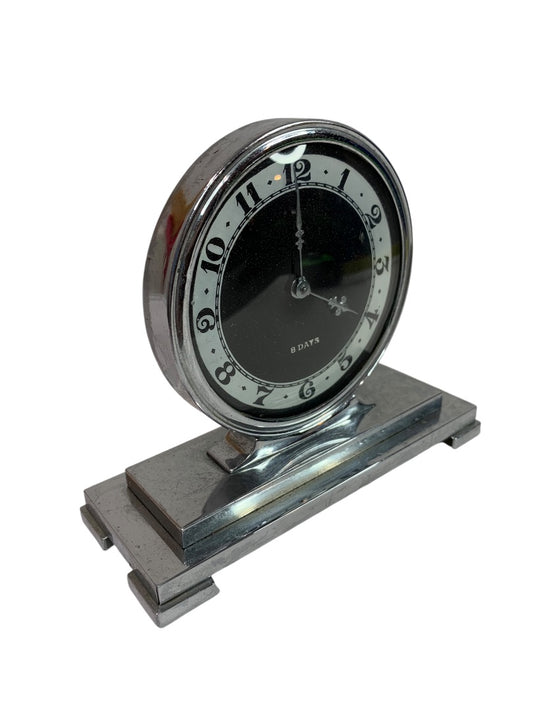 Vintage 1950s Germany Table Clock 8 Day Gesetzlich Geschutzt Silvertone Black