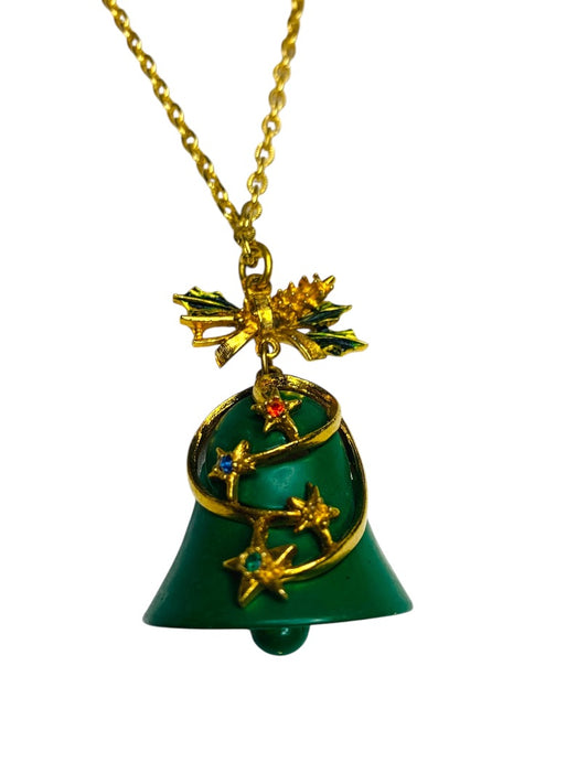 Vintage Holiday Necklace 23 Inch Goldtone Green Bell Pendant Christmas