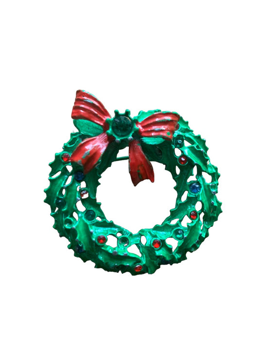 Vintage Holiday Wreath Brooch Green Red Blue Stones Pin 2" Diameter