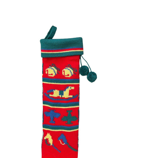 Vintage Knit Christmas Stocking Pom Pom Rocking Horse Airplane Toy Classic