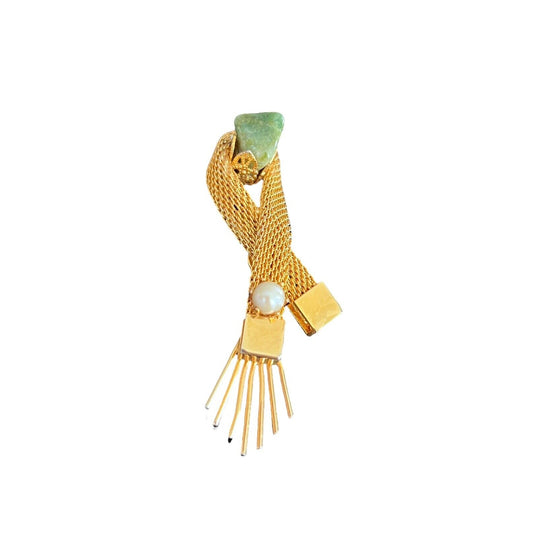 Vintage Jade Chip Mesh Ribbon Scarf Brooch Pin Gold Tone Faux Pearl