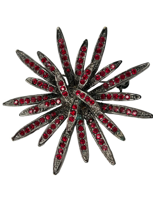Vintage Red Crystal Silvertone Dramatic Flower Brooch Pin 2" Diameter