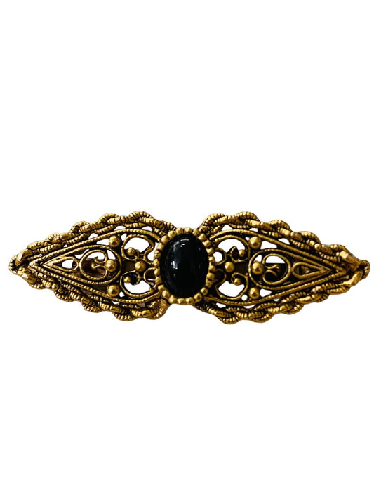 Vintage Victorian Style Brooch Goldtone Black Pin Filigreee Intricate 2" Length