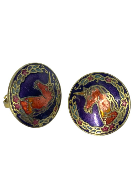 Vintage Unicorn Goldtone Clip On Non-Pierced Earrings Cloissone 3/4" Diameter