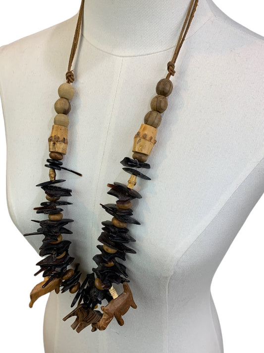 Vintage Wood Carved Exotic Necklace Animals Adjustable Zebra Elephant