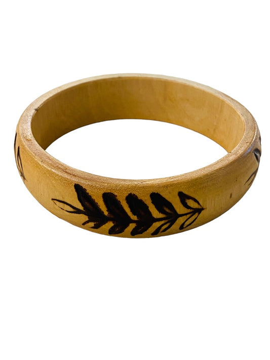 Vintage Wooden Bangle Bracelet Wood Burned Fern Design 2.75" Inside Diameter