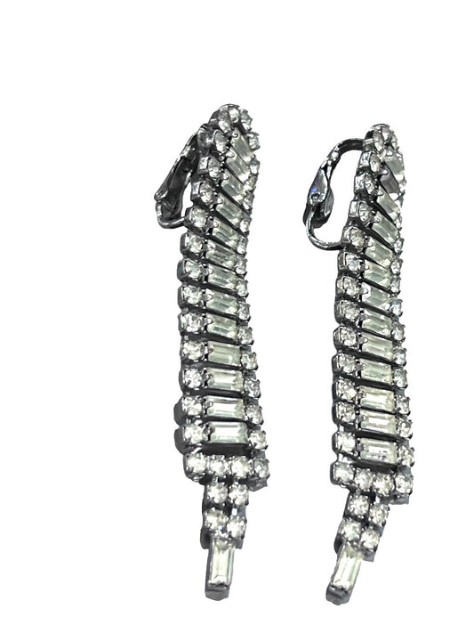 Weiss Crystal Rhinestone Clip Earrings Dangle Haute Couture Silver Clear Art Deco Signed