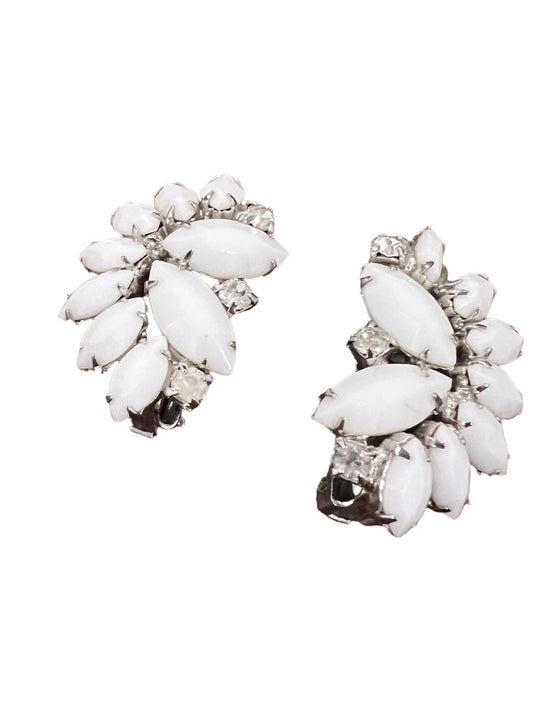 Weiss White Cabochon Rhinestone Clip On Earrings Silver Tone
