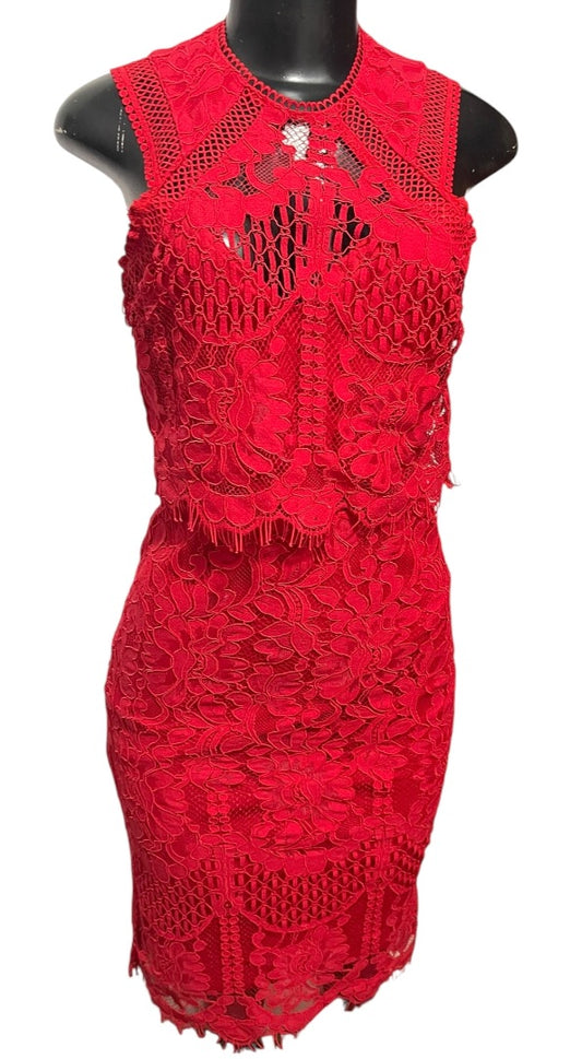 XS Lulus Sweetness Lace Crochet Overlay Sleeveless Fitted Midi Dress Back Zipper Red