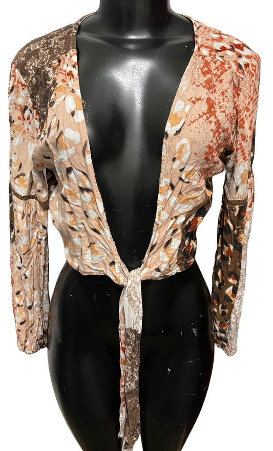 XS Raga Congo Women's Brown Multi Print Tie Front Crop Top Long Sleeve Blouse