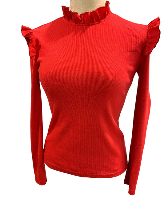 XS Womens Red Ribbed Ruffle Shoulder Shirt Long Sleeve Knit