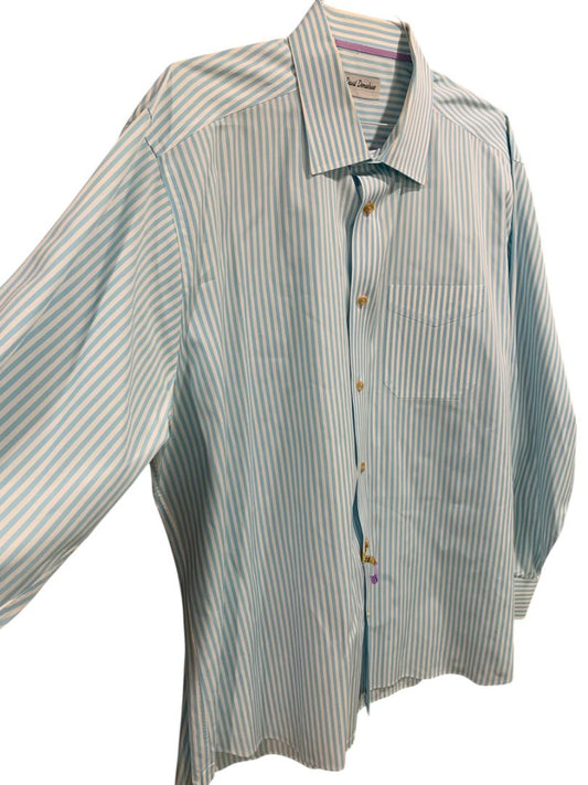 XXL David Donahue Mens Button Up Dress Shirt Aqua White Stripe