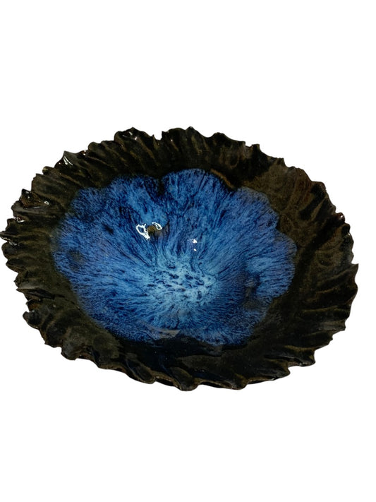 Art Pottery Signed Blue Black Bowl Textured Edge Vintage 7 Inch Diameter