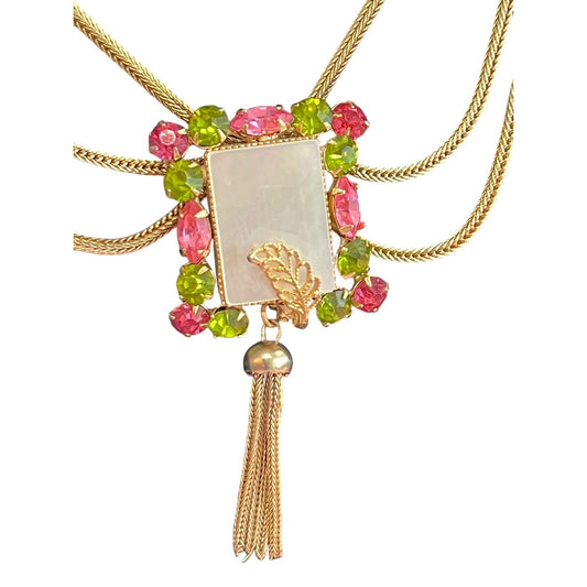 Art Deco Green Pink Rhinestone Festoon Swag Necklace Vintage Rectangle Leaf Acce