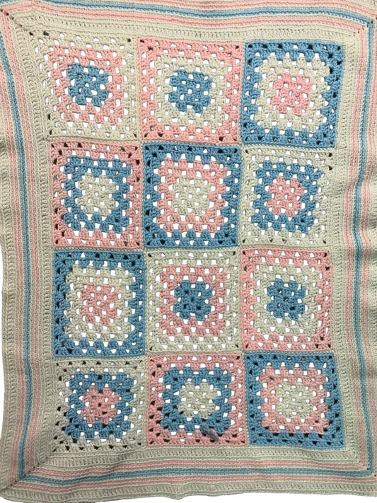Vintage Baby Blanket Crocheted White Blue Pink Granny Square 39 x 30 Inch