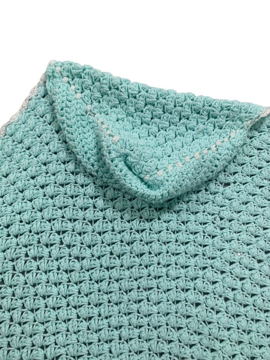 Vintage Mint Green Baby Blanket Crochet White Trim 37" x 34" Hood