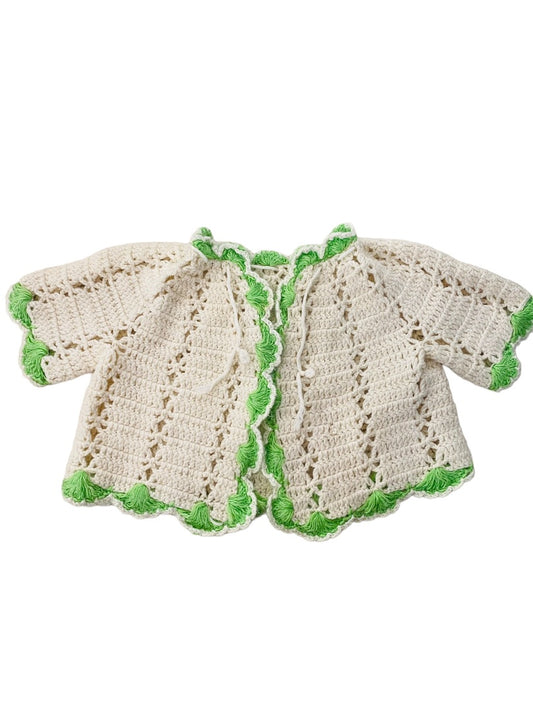 Vintage Hand Crocheted Baby Sweater Cream Green Trim Tie Closure Cardigan 12-24 Mos