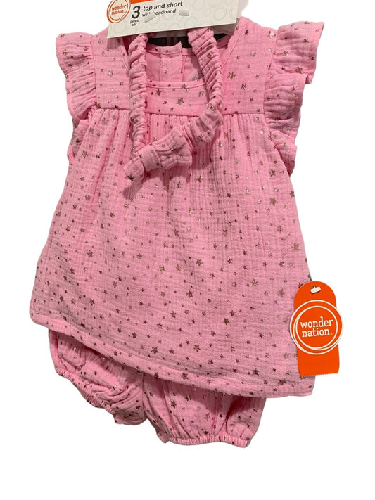 12 Months Baby Girls Pink New 3 Top Short with Headband Star Metallic