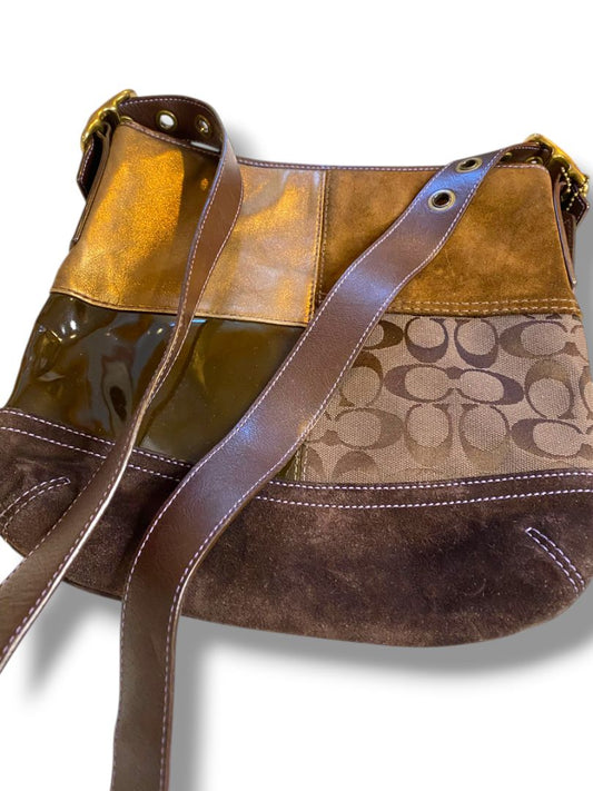 Vintage Coach Patchwork Brown Metallic and Suede Shoulder Bag F10421