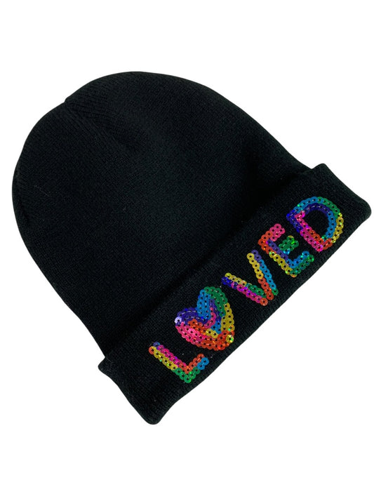 One Size Girls Black Sweater Knit Beanie Hat "Loved" Sequins