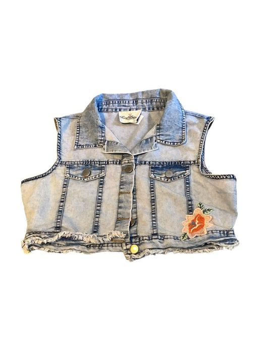 14 Girls Rare Edition Cropped Lightweight Denim Vest Raw Hem Flower Embroidery