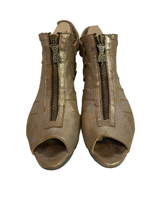 Size 38 Fly London Gold Leather Sling Back Peeptoe Sandals 2.5" Block Heel