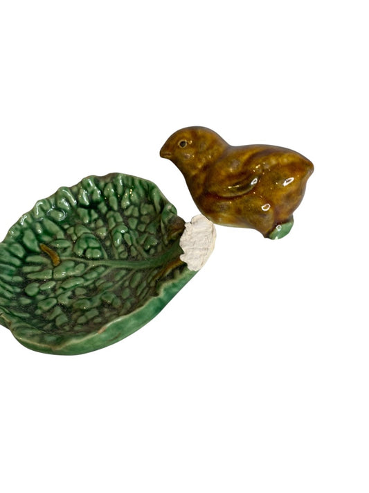 Vintage Portugal Bird on Leaf Trinket Dish "97" Pottery Broken for Repair Potential