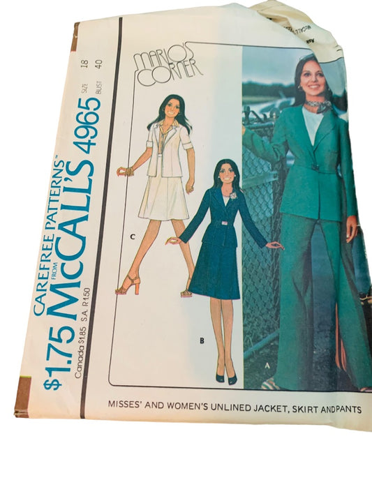 Size 18 McCall's 4965 Uncut Vintage 1970s Marlos Corner Misses Womens Unlined Jacket Skirt Pants