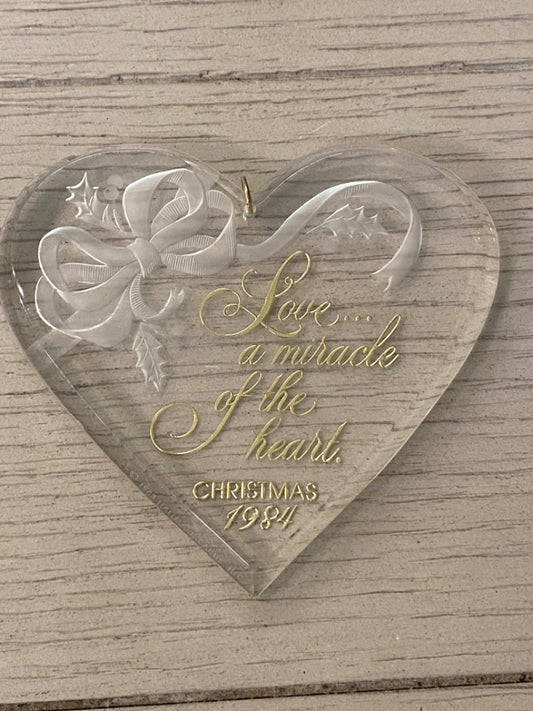 Clear Acrylic Christmas 1984 Ornament "Love . . .a Miracle of the Heart"