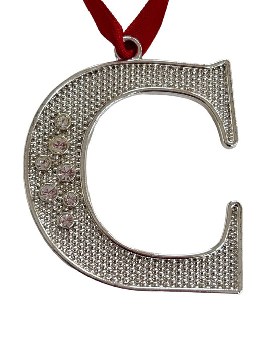 Harvey Lewis Silvertone "C" Initial Ornament 2" on Red Ribbon