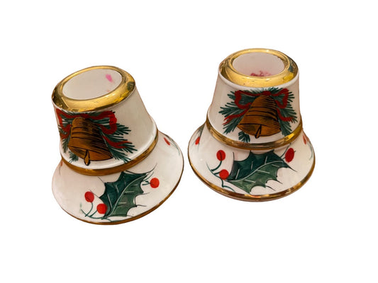 Set of 2 Italian Hand Painted 22/376 Christmas Holly Candle Holders 2.5" x 3"d