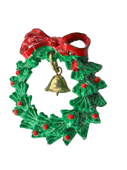 Vintage Holiday Christmas Wreath with Bell Brooch Pin 1 5/8" Diameter