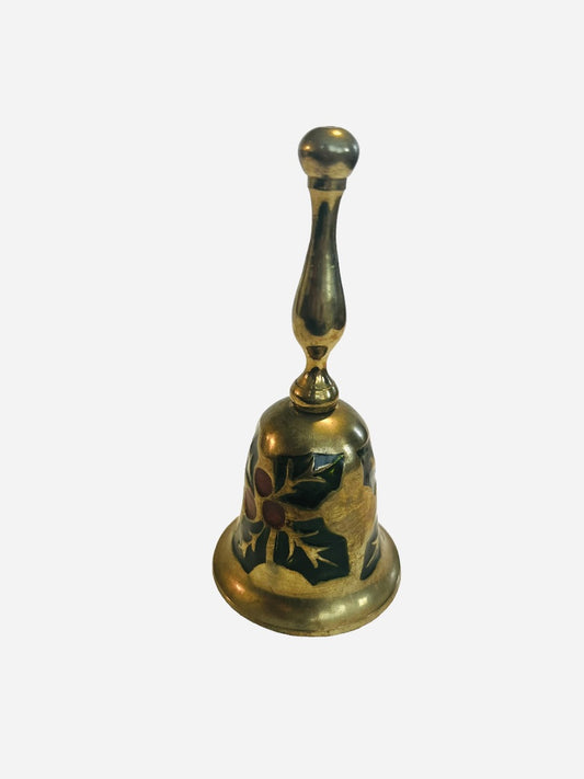Vintage Brass Hand Bell Enameled Holly Christmas Decor