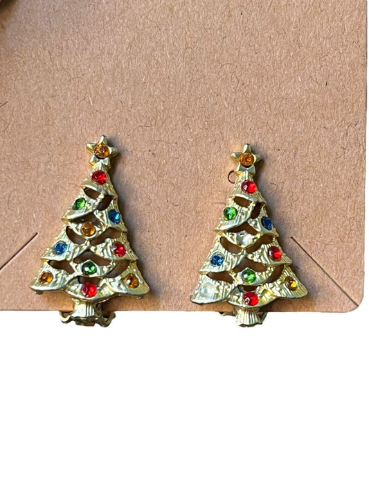 Vintage Christmas Tree Clip On Earrings Goldtone Rhinestone