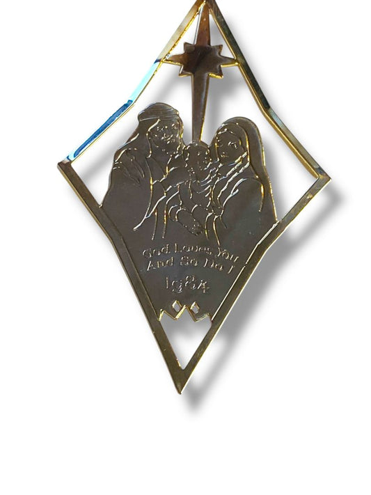 1984 Dated Goldtone Navity Ornament God Loves You So Do I 4.5"