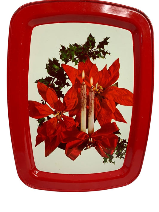 Vintage Holiday Christmas Metal Serving Tray 15 x 11 Inch Poinsettia Candle