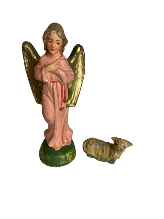 Midcentury Nativity Paper Mache Angel and Lamb Figurines 5 Inch Repaired