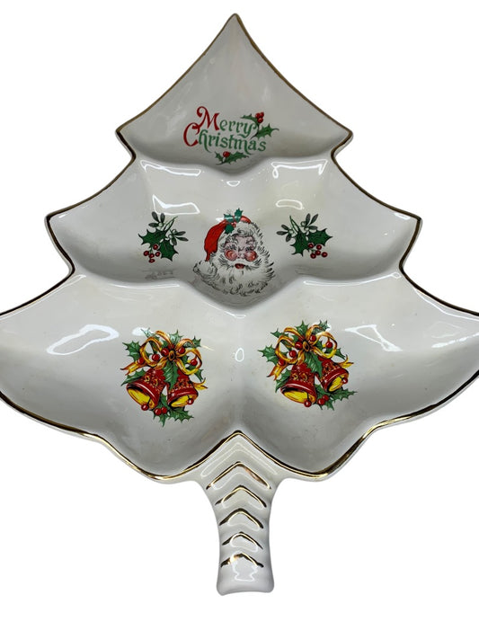 Vintage MCM Holiday Christmas Candy Nut Dish Santa Gold Trim 14 Inch