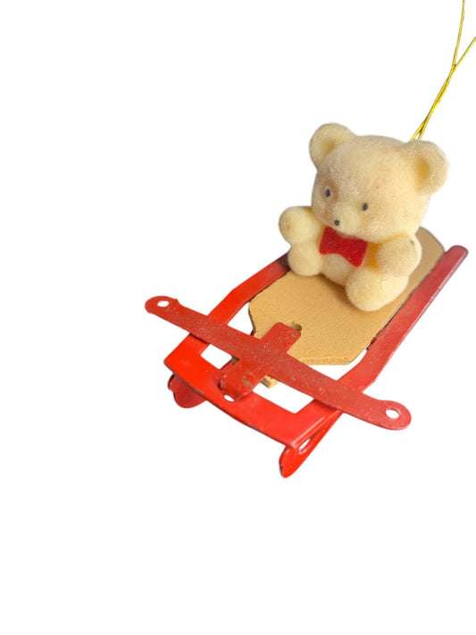Vintage Flocked Teddy Bear on Sled Ornament Metal Wood
